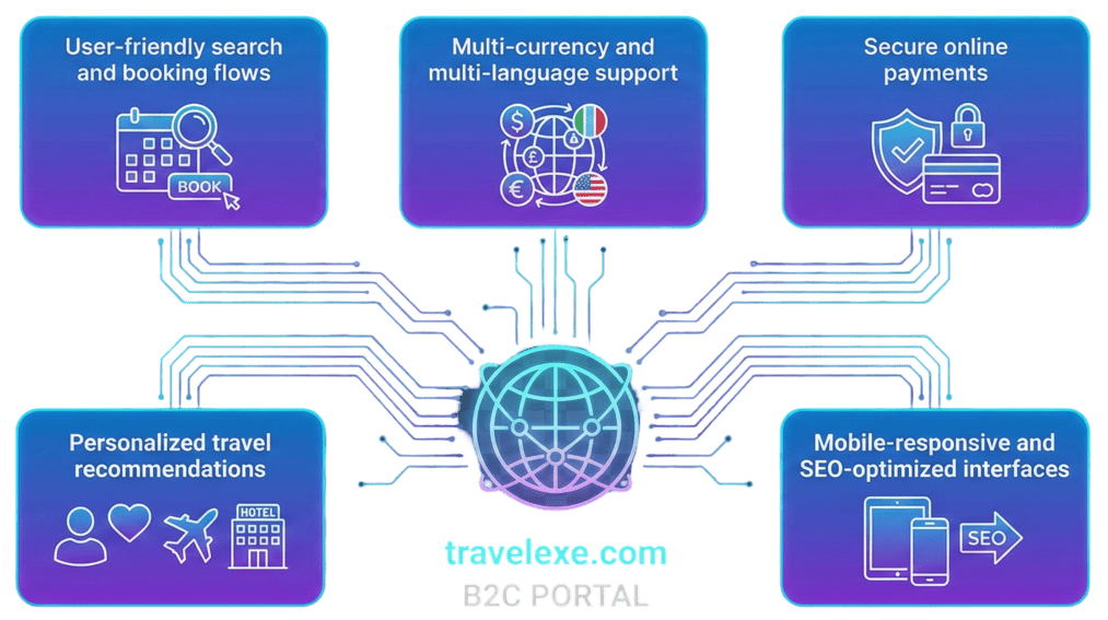 For B2C customers, we build intuitive, conversion-optimized travel websites. The result is a seamless customer experience that drives engagement, trust, and repeat bookings.