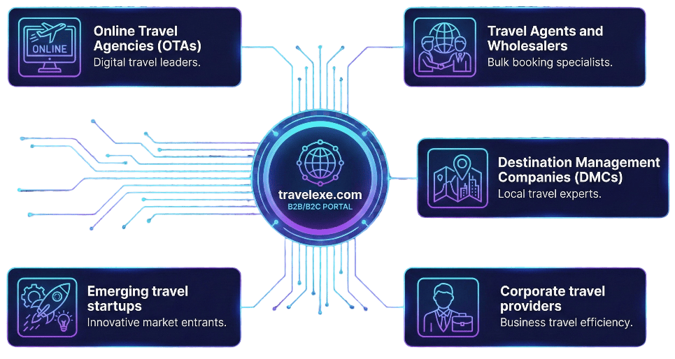 At Travelexe.com, we design and develop high-performance B2B and B2C travel portals that empower travel agencies, OTAs, wholesalers, and DMCs to operate digitally, efficiently, and at scale.
